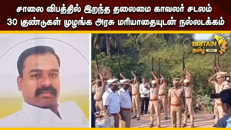 சாலை விபத்தில் இறந்த தலைமை காவலர் சடலம் 30 குண்டுகள் முழங்க அரசு மரியாதையுடன் நல்லடக்கம்5