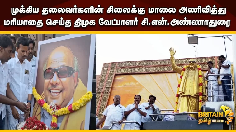 அதன்படி திருவண்ணாமலை நாடாளுமன்ற தொகுதி வேட்பாளர் சி என் அண்ணாதுரை இன்று முத்தமிழ் அறிஞர் கலைஞரின் முழு உருவ சிலக்கு மாலை அணிவித்து மரியாதை செய்தார்