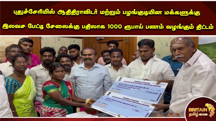 புதுச்சேரியில் ஆதிதிராவிடர் மற்றும் பழங்குடியின மக்களுக்கு இலவச பேட்டி சேலைக்கு பதிலாக 1000 ரூபாய் பணம் வழங்கும் திட்டம் முதல்வர் ரங்கசாமி தொடங்கி வைத்தார்.