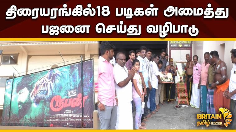 கரூரைச் சேர்ந்தவர்கள் தயாரித்து திரையரங்கில் இன்று வெளியான ஐயப்பன் சுவாமியை கதைக்களமாகக் கொண்ட திரைப்படம் – திரையரங்க வளாகத்தில் ஐயப்ப சுவாமியின் படத்தை வைத்து, 18 படிகள் அமைத்து பஜனை செய்து வழிபாடு.