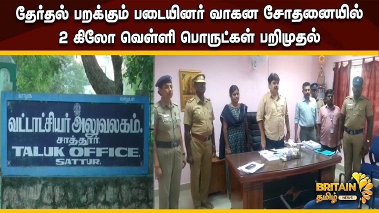 விருதுநகர் மாவட்டம் சாத்தூர் அருகே வெம்பக்கோட்டை துணை வட்டார வளர்ச்சி அலுவலர் ரேவதி தலைமையிலான தேர்தல் பறக்கும் படை குழுவினர் சாத்தூர் அருகில் உள்ள இராமலிங்கபுரம் கிராமத்தில் வாகன சோதனையில் ஈடுபட்டுக் கொண்டிருந்த போது அவ்வழியாக வந்த இருசக்கர வாகனத்தை நிறுத்தி சோதனை செய்தபோது வாகனத்தில் இருந்த பையில் வெள்ளி பொருட்கள் இருப்பது தெரிய வந்தது.