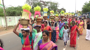 பின்னர் நவதானியங்கள் கொண்டு வளர்க்கப்பட்ட முளைப்பாரிகளை பெண்கள் தலையில் சுமந்து ஊர்வலமாக சென்றனர் அம்மன் கரகத்தை கோவில் பூசாரி எடுத்து முன் செல்ல மங்கள வாத்தியங்களுடன் முளைப்பாரி ஊர்வலம் நகரின் முக்கிய வீதிகள் வழியாக சென்று நகர் தெப்பக்குளத்தில் கரைத்தனர்.