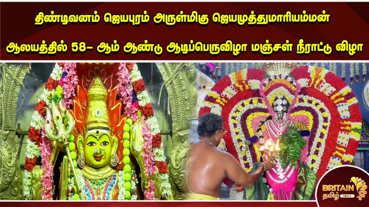விழுப்புரம் மாவட்டம், திண்டிவனம் ஜெயபுரம் அருள்மிகு ஜெய முத்துமாரியம்மன் ஆலயத்தில் 58- ஆம் ஆண்டு ஆடிப்பெருவிழா என்னும் வசந்த உற்சவ திருவிழாவில் இறுதி நாள் நிகழ்ச்சியாக மஞ்சள் நீராட்டு விழாவை முன்னிட்டு வண்ண மலர்களால் அலங்கரிக்கப்பட்ட அம்மன் நின்றபடியே கையில் குடத்துடன் வீதி உலா வந்தார்.