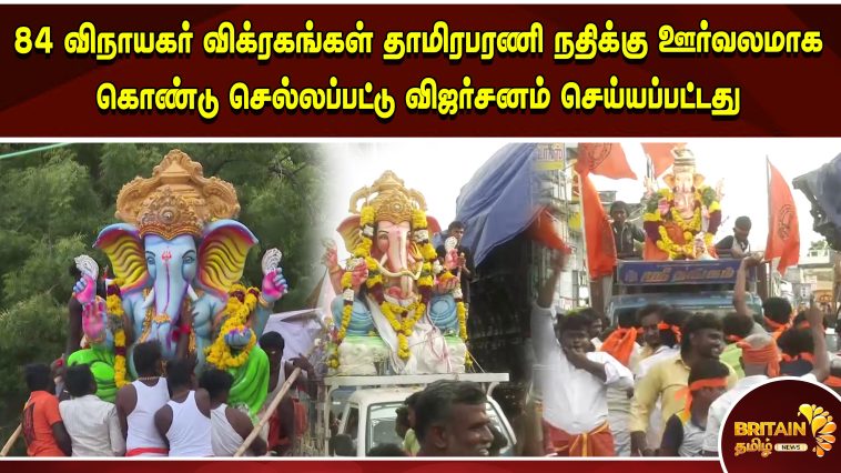 84 விநாயகர் விக்ரகங்கள் தாமிரபரணி நதிக்கு ஊர்வலமாக கொண்டு செல்லப்பட்டு விஜர்சனம் செய்யப்பட்டது