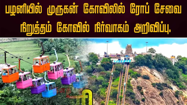 பழனியில் முருகன் கோவிலில் பராமரிப்பு பணி காரணமாக இன்று ஒரு நாள் மட்டும் ரோப் சேவை நிறுத்தம் கோவில் நிர்வாகம் அறிவிப்பு.