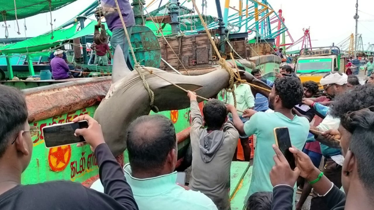 அபூர்வமாக வலையில் சிக்கி மிகவும் சிரமத்துடன் மீனவர்கள் கரைக்கு கொண்டு வந்து சேர்த்தனர். இந்த சுறா மீன் ஒன்றரை லட்சம் விலை போய் உள்ளதாக மீனவர்கள் தெரிவித்தனர்.