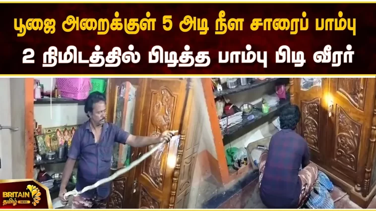 இந்த நிலையில் நேற்று இரவு மீண்டும் பூஜை அறைக்கு அதே சாரைப் பாம்பு வந்துள்ளது. இதனையடுத்து ரங்கராஜ் மயிலாடுதுறை மாவட்டம் சீர்காழியில் உள்ள பாம்பு பிடி வீரர் பாண்டியன் என்பவருக்கு தொலைபேசி மூலம் தகவல் கொடுத்துள்ளார்.