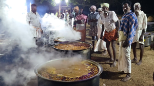வேட்டைக்காரன் கோவில் திருவிழாவை முன்னிட்டு ஆண்கள் மட்டுமே பங்கேற்ற கறிவிருந்து விழா