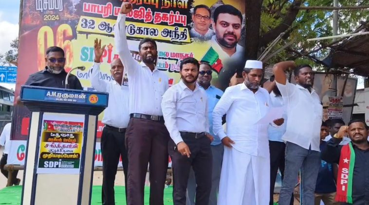 மேலப்பாளையம் டிசம்பர் 6 பாபரி மஸ்ஜித் தகர்க்கப்பட்ட தினத்தில் பாசத்தை எதிர்ப்பு நாள் பாபர் மசூதி தகர்ப்பு 32 ஆண்டு கால அநீதி என்கின்ற தலைப்பில் எஸ்டிபிஐ கட்சியின் நெல்லை மாநகர் மாவட்டத்தின் சார்பில் மேலப்பாளையம் சந்தை ரவுண்டானா அருகில் பெருந்திரள் ஆர்ப்பாட்டம் நடைபெற்றது.