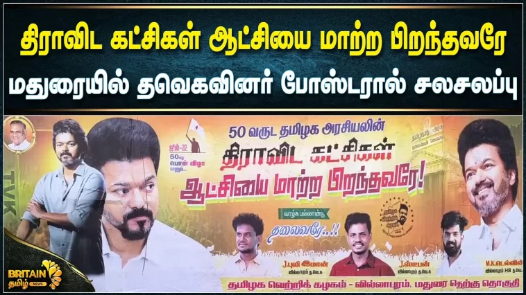 50 வருட தமிழக அரசியலின் திராவிட கட்சிகள் ஆட்சியை மாற்ற பிறந்தவரே என விஜய் பிறந்தநாளையொட்டி தவெகவினர் ஒட்டியுள்ள போஸ்டர்