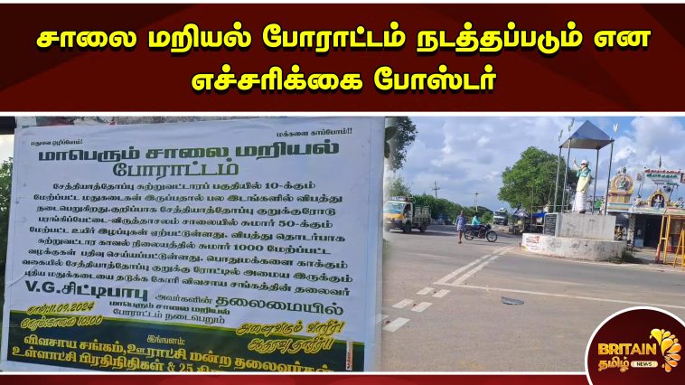 பொதுமக்கள் விவசாய சங்கத்தினரின் எதிர்ப்பை மீறினால் சாலை மறியல் போராட்டம் நடத்தப்படும் என எச்சரிக்கை போஸ்டர்.