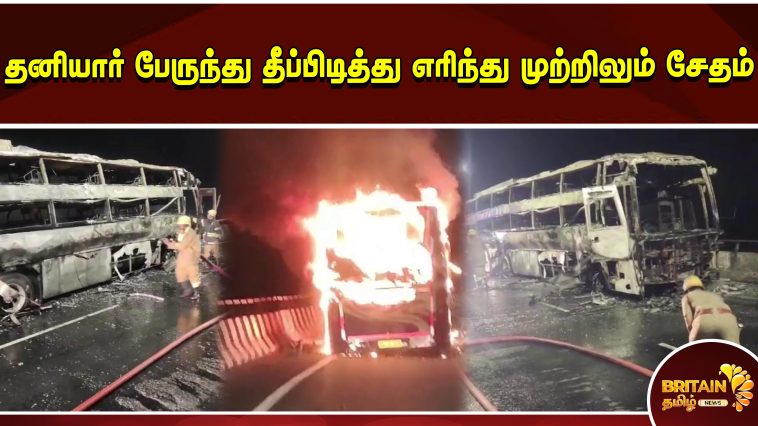 தனியார் பேருந்து தீப்பிடித்து எரிந்து முற்றிலும் சேதம்
