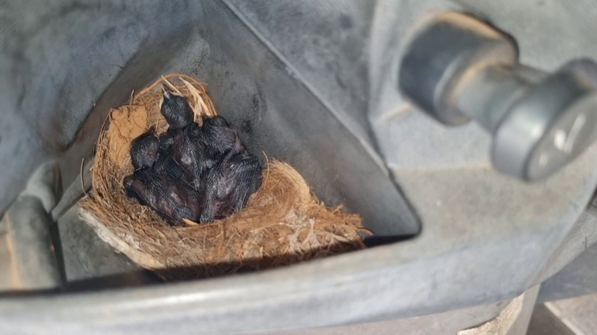 வழக்கம் போல தனது ஸ்கூட்டரை பார்க்கிங் பகுதியில் நிறுத்திவிட்டு வேலை முடித்துவிட்டு தனது வண்டியை ஸ்டார்ட் செய்ய போனபோது ஸ்கூட்டரின் முன்பகுதியில் குருவி கூடு கட்டி இருப்பது தெரிய வந்தது. குஞ்சு பொரிப்பதற்காக தான் கூடு கட்டியிருக்கும் என அறிந்த இவர். குருவிகளை தொந்தரவு செய்யாமல் பேருந்தில் வீட்டுக்கு செல்லலாம் என முடிவெடுத்தார். தற்போது மூன்று முட்டைகளில் இருந்து மூன்று குஞ்சுகள் வெளிவந்து மூன்று குருவிகளும் பாதுகாப்பாக ஸ்கூட்டியில் தங்கி உள்ளது.