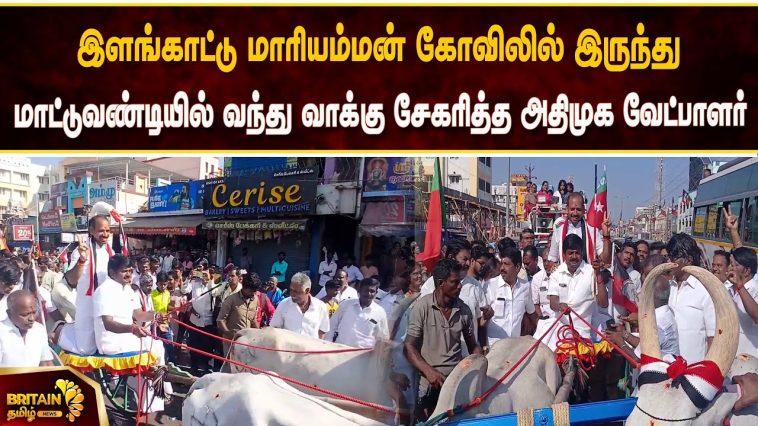 இளங்காட்டு மாரியம்மன் கோவிலில் இருந்து மாட்டுவண்டியில் வந்து வாக்கு சேகரித்த அதிமுக வேட்பாளர்