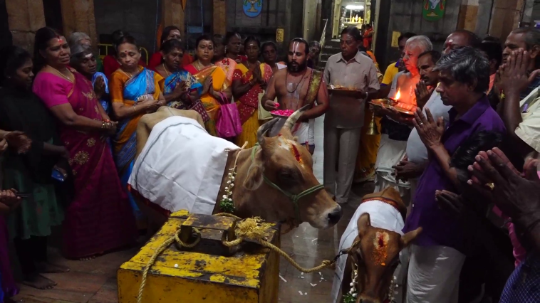 பசுவுக்கும் கன்றுக்கும் புது வஸ்திரம் அணிவித்து ஸ்ரீசுக்தம் சொல்லி பூக்கள் மற்றும் குங்குமத்தால் அா்ச்சனை செய்யப்பட்டது. பின்னா் பால் நைவேத்யம் செய்யப்பட்டு கற்பூர ஆரத்தி காண்பிக்கப்பட்டது. கோ பூஜை முடிந்ததம் பக்தா்கள் கோமாதாவை வலம் வந்து வணங்கி பசுக்களுக்கு பழங்கள், கீரைகள் வழங்கி வழிபட்டனா்.