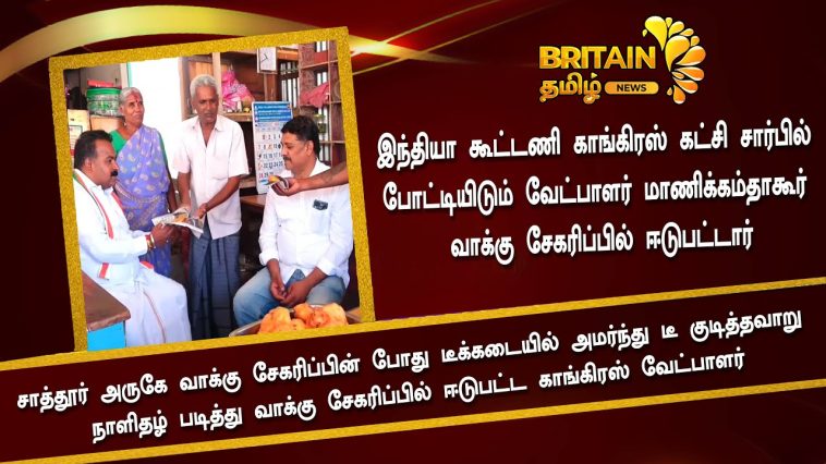 சாத்தூர் அருகே வாக்கு சேகரிப்பின் போது டீக்கடையில் அமர்ந்து டீ குடித்தவாறு நாளிதழ் படித்து வாக்கு சேகரிப்பில் ஈடுபட்ட காங்கிரஸ் வேட்பாளர்