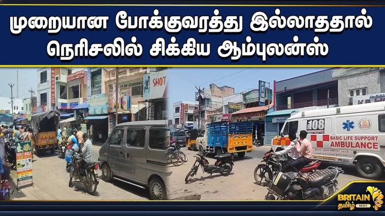 திருவண்ணாமலை மாவட்டம், வந்தவாசி தேரடிப்பகுதி வங்கிகள் ,வணிக நிறுவனங்கள் உள்ள பகுதி.எனவே எப்பொழுதும் மக்கள் நடமாட்டம் மிகுந்து காணப்படும். மேலும், வந்தவாசி-தின்டிவனம் சாலையில் நெடுஞ்சாலை துறையினரால் சாலை மேம்பாட்டு பணிகள் நடைபெறுகின்றன. வழக்கமாக வணிக நிறுவனங்கள் மற்றும் வங்கிகளின் வாசல்களில் நிறுத்தி வைக்கப்படும் இருசக்கர வாகனங்களால் போக்குவரத்து நெருக்கடி ஏற்படுகிறது. குறிப்பாக தேரடிப் பகுதியில் சாலைப் பணிகள் நடைபெற்று வருவதால் நெரிசலில் வாகனங்கள் சிக்குகின்றன. இந்நிலையில் அந்த வழியே வந்த ஆம்புலன்ஸ் வாகனம் சிக்கியது.