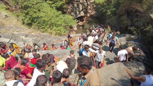 திருப்பதி மலையில் உள்ள பாப விநாசம் பகுதியில் இருந்து சுமார் 5 கிலோ மீட்டர் தொலைவில் அடர்ந்த வனப்பகுதியில் பிளவு பட்ட மலைகளுக்கு இடையே பள்ளத்தாக்கில் இருக்கும் குமாரதார தீர்த்தத்திற்கு நேற்று பல்லாயிரக்கணக்கான பக்தர்கள் மிகுந்த பிரயாசையுடன் சென்றனர்.