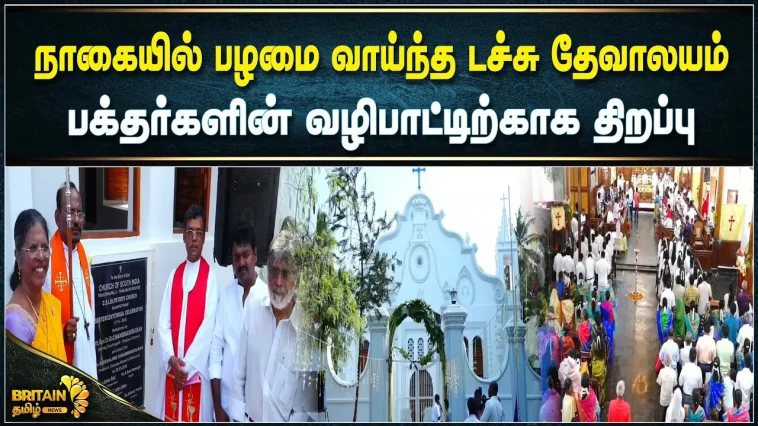 நாகையில் 250 ஆண்டுகளுக்கு முன் கட்டப்பட்ட பழமை வாய்ந்த டச்சு தேவாலயம் பக்தர்களின் வழிபாட்டிற்காக திறப்பு; 80, லட்சம் ரூபாய் மதிப்பில் புதிப்பிக்கப்பட்ட சிஎஸ்ஐ தூய பேதுரு தேவாலய திறப்பு விழாவில், திரளான கிறிஸ்தவர்கள், பேராயர்கள் பங்கேற்பு.