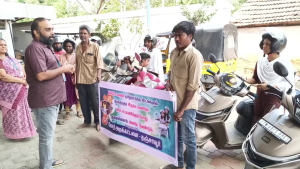 பைக்னா ஹெல்மெட் இருக்கனும் என்கிற வாசகத்துடன் நடந்த விழிப்புணர்வு நிகழ்வில் ஹெல்மெட் அணிந்து வந்தவர்களுக்கு தலா விலையில்லாமல் இரண்டு லிட்டர் பெட்ரோல், அரை கிலோ ஸ்வீட், திருக்குறள் புத்தகம் வழங்கப்பட்டது.