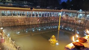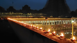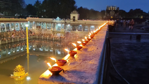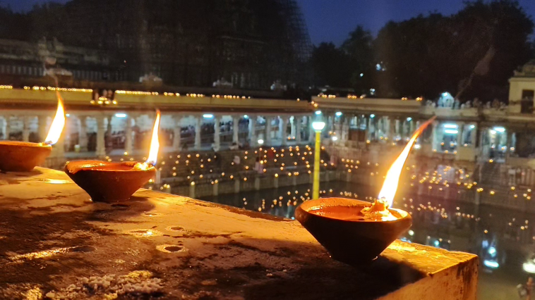 மதுரை மீனாட்சியம்மன் கோயிலில் பொற்றாமரை குளம் முழுவதும் லட்ச தீபம் ஏற்றி வழிபாடு