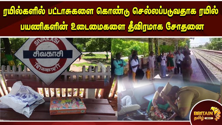சட்ட விரோதமாக ரயில்களில் பட்டாசுகளை கொண்டு செல்லப்படுவதாக வந்த தகவலைத் தொடர்ந்து சிவகாசி ரயில் நிலையத்தில் ஸ்ரீவில்லிபுத்தூர் இரும்பு பாதை போலீசார் ரயில் பயணிகளின் உடைமைகளை தீவிரமாக சோதனை செய்தனர்.