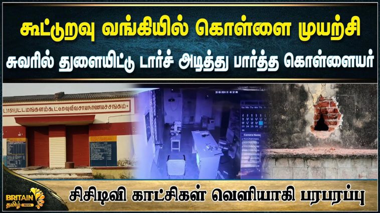 திருச்சுழி அருகே தொடக்க வேளாண்மை கூட்டுறவு வங்கியின் சுவரில் துளையிட்டு கொள்ளை முயற்சி; வங்கியின் லாக்கரை உடைக்க முடியவில்லை என்பதால் வங்கியில் இருந்த 67 சவரன் தங்க நகைகள் தப்பியது; சுவரில் துளையிட்டு அந்த துளையின் வழியாக கையை விட்டு வங்கியின் உள்ளே டார்ச் அடித்து பார்க்கும் சிசிடிவி காட்சிகள் வெளியாகி பரபரப்பு