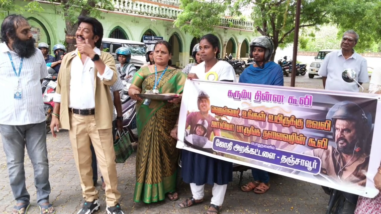 தஞ்சையில் ரஜினியின் பஞ்ச் டயலாக்கை பேசி ஹெல்மேட் குறித்து விழிப்புணர்வு