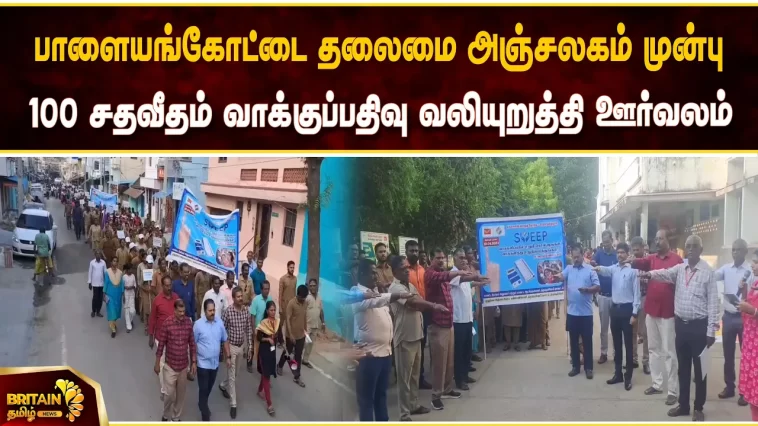 பாளையங்கோட்டை தலைமை அஞ்சலகம் முன்பு 100 சதவீதம் வாக்குப்பதிவு வலியுறுத்தி தேர்தல் விழிப்புணர்வு ஊர்வலம் இன்று நடைபெற்றது முதல் நிலை அஞ்சலக கோட்ட கண்காணிப்பாளர் செந்தில்குமார் தலைமையில் நடந்த இந்த விழிப்புணர்வு ஊர்வலத்தில் பாளையங்கோட்டை தொகுதி உதவி தேர்தல் ஆணையர் மாநகராட்சி கமிஷனர் தாக்கரே சுபம் ஞானதேவராவ் கொடியசைத்து தொடங்கி வைத்தார் இந்த தேர்தல் விழிப்புணர்வு ஊர்வலம் பாளை தலைமை அஞ்சலகத்தில் தொடங்கி பெருமாள் கீழரத வீதி வடக்கு ரத வீதி மேல ரத வீதி மற்றும் தெற்கு பஜார் வழியாக நடைபெற்றது