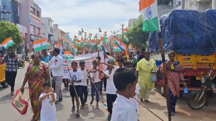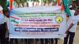 நாட்டின் 79 வது சுதந்திர தின விழாவை முன்னிட்டு பெண் குழந்தைகள் பாதுகாப்பு தலைக்கவசம் அணிவது குறித்து தேசியக் கொடியுடன் சிலம்பம் சுற்றி பேரணியாக வந்த சிறுவர்கள் வந்தே மாதரம் என பிஞ்சு குழந்தைகளின் முழக்கம் பார்ப்போரை கண் கவர செய்தது.