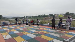 தாமிரபரணி நதியின் அழகை காணும் வகையில் ஸ்மார்ட் சிட்டி திட்டத்தின் கீழ் அமைக்கப்பட்டுள்ள மாடத்தில் பத்துக்கும் மேற்பட்ட மாணவ மாணவிகள் ஒன்றிணைந்து தாமிரபரணி நதியை பார்த்து நேரடியாக பார்க்கும் காட்சிகளை தத்ரூப ஓவியமாக வரைந்து அசத்தினர்.