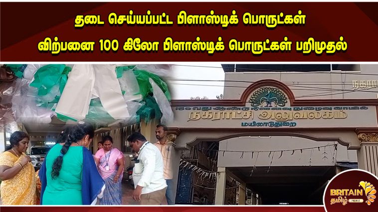 மயிலாடுதுறையில் தடை செய்யப்பட்ட பிளாஸ்டிக் பொருட்கள் விற்பனை செய்த ஆறு கடைகளுக்கு அபராதம் விதிக்கப்பட்டது, 100 கிலோ பிளாஸ்டிக் பொருட்கள் பறிமுதல்.