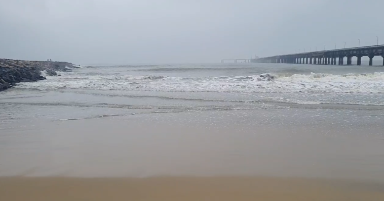 நாகையில் புயல் சின்னம் காரணமாக கடல் சீற்றத்துடன் காணப்படுவதால் கடல் அலைகள் சுமார் 3 அடி உயரத்திற்கு சீற்றத்துடன் காணப்படுகிறது
