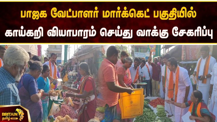 கரூரில் எம்எல்ஏ சரஸ்வதி உடன் பிரச்சாரத்திற்கு சென்ற பாஜக வேட்பாளர் செந்தில்நாதன் வெங்கமேடு மார்க்கெட் பகுதியில் காய்கறி வியாபாரம் செய்து வாக்கு சேகரிப்பு.