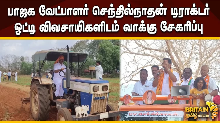 கரூர் தொகுதி பாஜக வேட்பாளர் செந்தில்நாதன் டிராக்டர் ஓட்டி விவசாயிகளிடம் வாக்கு சேகரிப்பு – கடுமையான வறட்சியில் உள்ள வேடசந்தூர் தொகுதியில் குடிநீர் தேவை மட்டுமின்றி, விவசாயம் செழிக்கவும் பாடுபடுவேன் என வாக்குறுதி.