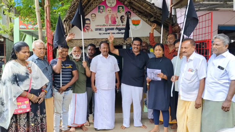 தமிழக முதல்வர் மு.க.ஸ்டாலினை கண்டித்தும் பா.ஜ.க வினர் கருப்பு கொடி ஏந்தி ஆர்ப்பாட்டம்