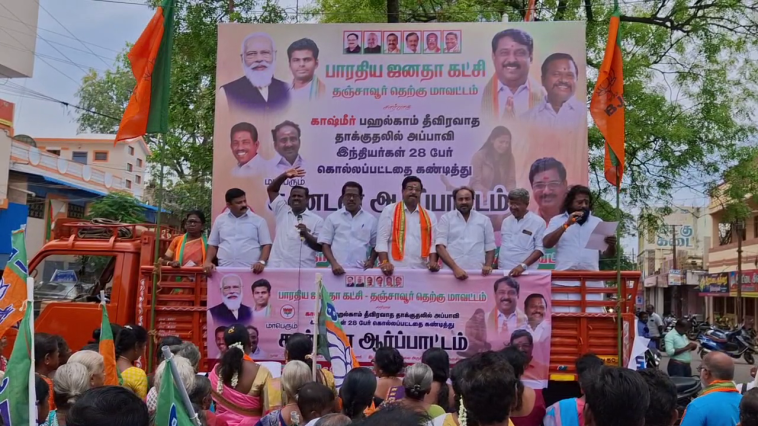 காஷ்மீர் பஹல்காம் தீவிரவாத தாக்குதலில் அப்பாவி இந்தியர்கள் 28 பேர் கொல்லப்பட்டதை கண்டித்து தஞ்சாவூரில் பாஜக கட்சி சார்பில் கீழவாசல் பகுதியில் கண்டன ஆர்ப்பாட்டம் நடைபெற்றது,