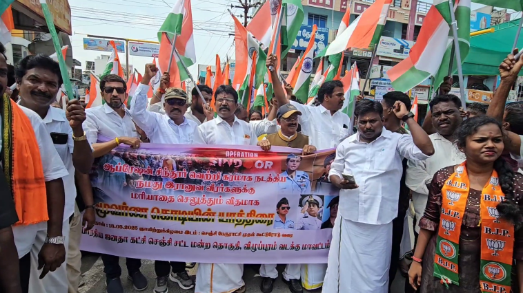 விழுப்புரம் மாவட்டம் செஞ்சியில் பாஜகவினர் தேசிய கொடியை ஏந்தி பாகிஸ்தான் மீதான ஆபரேஷன் சிந்தூர் வெற்றிக்கு இந்திய ராணுவத்தின் முப்படைகளுக்கு நன்றி தெரிவிக்கும் விதமாக யாத்திரை பேரணி நடைபெற்றது.