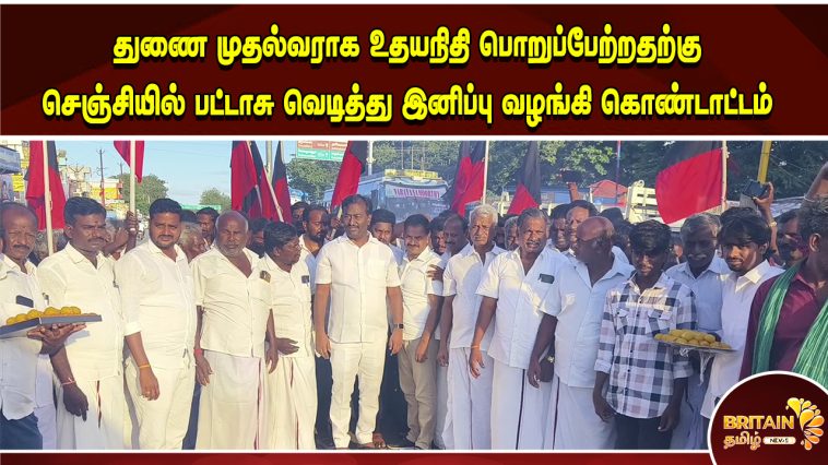 துணை முதல்வராக உதயநிதி பொறுப்பேற்றதற்கு செஞ்சியில் பட்டாசு வெடித்து இனிப்பு வழங்கி கொண்டாட்டம்