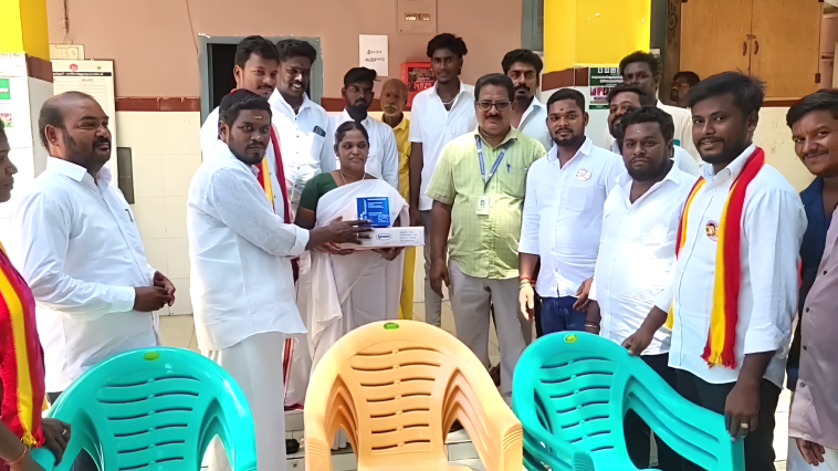 தமிழக வெற்றி கழக சார்பில் ஆரம்ப சுகாதார நிலையத்திற்கு நாற்காலி, ரத்த அழுத்தமானி, எடை பார்க்கும் கருவி.