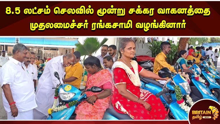 புதுச்சேரி சமூக நலத்துறையின் மூலம் மாற்றுத்திறனாளிகளுக்கு 8.5 லட்சம் செலவில் மூன்று சக்கர வாகனத்தை முதலமைச்சர் ரங்கசாமி பயனாளிகளுக்கு வழங்கினார்.