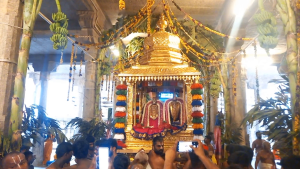 அதனைத் தொடர்ந்து மாலையில் ஸ்ரீவரமங்கா சமேத தெய்வநாயகப்பெருமாள் சிறப்பு அலங்காரத்தில் புண்யகோடி விமானம் என்று அழைக்கப்படும் தங்க சப்பரத்தில் எழுந்தருளி காட்சி அளித்தாா். திருக்கோயில் முன்மண்டபத்தில் நாங்குனோி மதுரகவி வானுமாமலை ஜீயா் சுவாமிகள் முன்னிலையில் தங்க சப்பரத்தில் எழுந்தருளிய பெருமாள் தாயாருக்கு சிறப்பு பூஜைகள் நடத்தப்பட்டது.