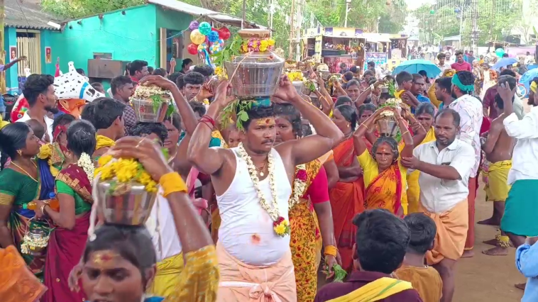 காப்புக்கட்டி விரதமிருந்த பெண்கள் மஞ்சாலடை அணிந்து தலையில் பால்குடம் சுமந்தும், பக்தர்கள் மயில் காவடி, பால் காவடி, அலகு காவடி உள்ளிட்ட காவடிகள் காந்திநகர், பாரதியார் நகர், வ.உ.சி நகர், தெற்கு தெரு உள்ளிட்ட பகுதிகளிலிருந்து மேளதாளங்கள் முழங்க ஆட்டம் பாட்டத்துடன் ஊர்வலமாக எடுத்து வந்து மாரியம்மனுக்கு நேர்த்திக்கடன் செலுத்தினர்.