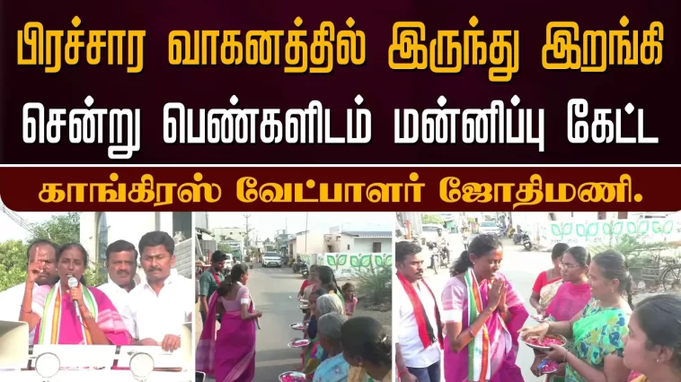 கரூரில் பிரச்சாரத்திற்கு செல்ல ஏற்பட்ட காலதாமதம் காரணமாக பிரச்சார வாகனத்தில் இருந்து இறங்கி சென்று பெண்களிடம் மன்னிப்பு கேட்ட காங்கிரஸ் வேட்பாளர் ஜோதிமணி.