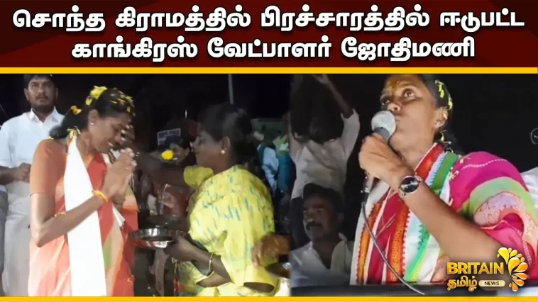 இந்த நிலையில் கரூர் பாராளுமன்ற தொகுதி காங்கிரஸ் வேட்பாளர் ஜோதிமணி சொந்த கிராமமான பெரிய திருமங்கலம் பகுதியில் தனது பிரச்சாரத்தை மேற்கொண்டார்.