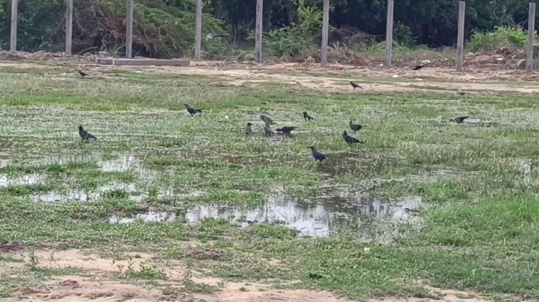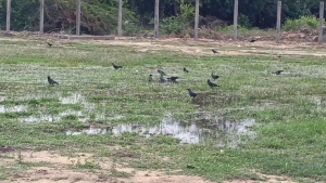 ச்சூ அப்பா என்னா வெயிலு; அடிக்கிற வெயிலுக்கு இத தவிர வேற வழி தெரியல; வெயில் தாக்கதை சமாளிக்க மழை நீரில் குளித்து சூட்டை தணித்த காகங்கள்