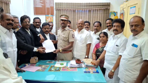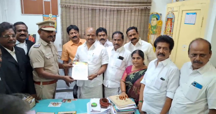கடலூர் கிழக்கு மாவட்ட திமுக செயலாளரும், சிதம்பரம் தொகுதி அதிமுக எம்எல்ஏவுமான கே.ஏ. பாண்டியன் தலைமையில் அக்கட்சியினர் சுமார் 200 பேர் இன்று ஊர்வலமாக வந்தனர். பின்னர் சிதம்பரம் நகர காவல் நிலையம் முன் முழக்கமிட்டு நகர காவல் நிலையத்தில் புகார் அளித்தனர்.