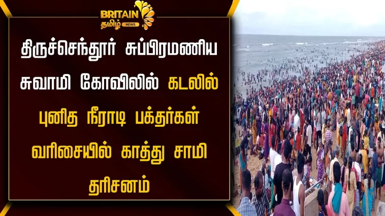 திருச்செந்தூர் சுப்பிரமணிய சுவாமி கோவிலில் கடலில் புனித நீராடி பக்தர்கள்