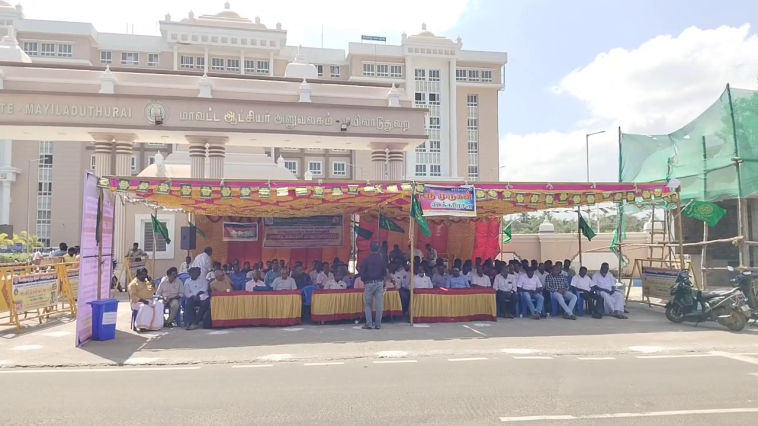 மயிலாடுதுறை மாவட்டம் மயிலாடுதுறை மாவட்ட ஆட்சியர் அலுவலகம் முன்பாக தமிழ்நாடு ஊரக வளர்ச்சித்துறை அலுவலர்கள் சங்கம் ஊராட்சி செயலர்களின் அடிப்படை கோரிக்கைகளை நிறைவேற்ற தமிழக அரசை வலியுறுத்தி மாவட்ட தலைநகரங்களில் தர்ணா போராட்டம் நடைபெற்றுவருகிறது.