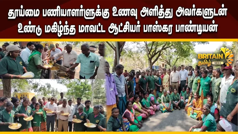 தூய்மை பணியாளர்ளுக்கு உணவு அளித்து மகிழ்ந்த மாவட்ட ஆட்சியர் பாஸ்கர பாண்டியன்